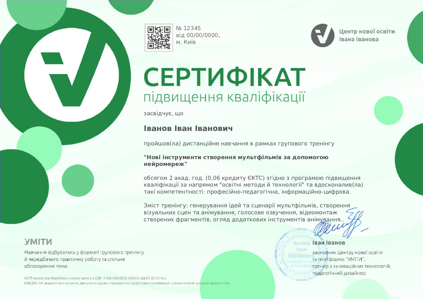 Центр нової освіти Івана Іванова (платформа "УМІТИ") є суб'єктом підвищення кваліфікації.Цей тренінг відповідає державним вимогам. Сертифікат, що видається, рекомендується до зарахування педпрацівнику як підвищення кваліфікації обсягом 2 акад. год. (0,06 кредиту ЄКТС) згідно Закону України "Про освіту", Постанови КМУ від 21.08.2019 № 800 та Постанови КМУ від 27.12.2019 № 1133.