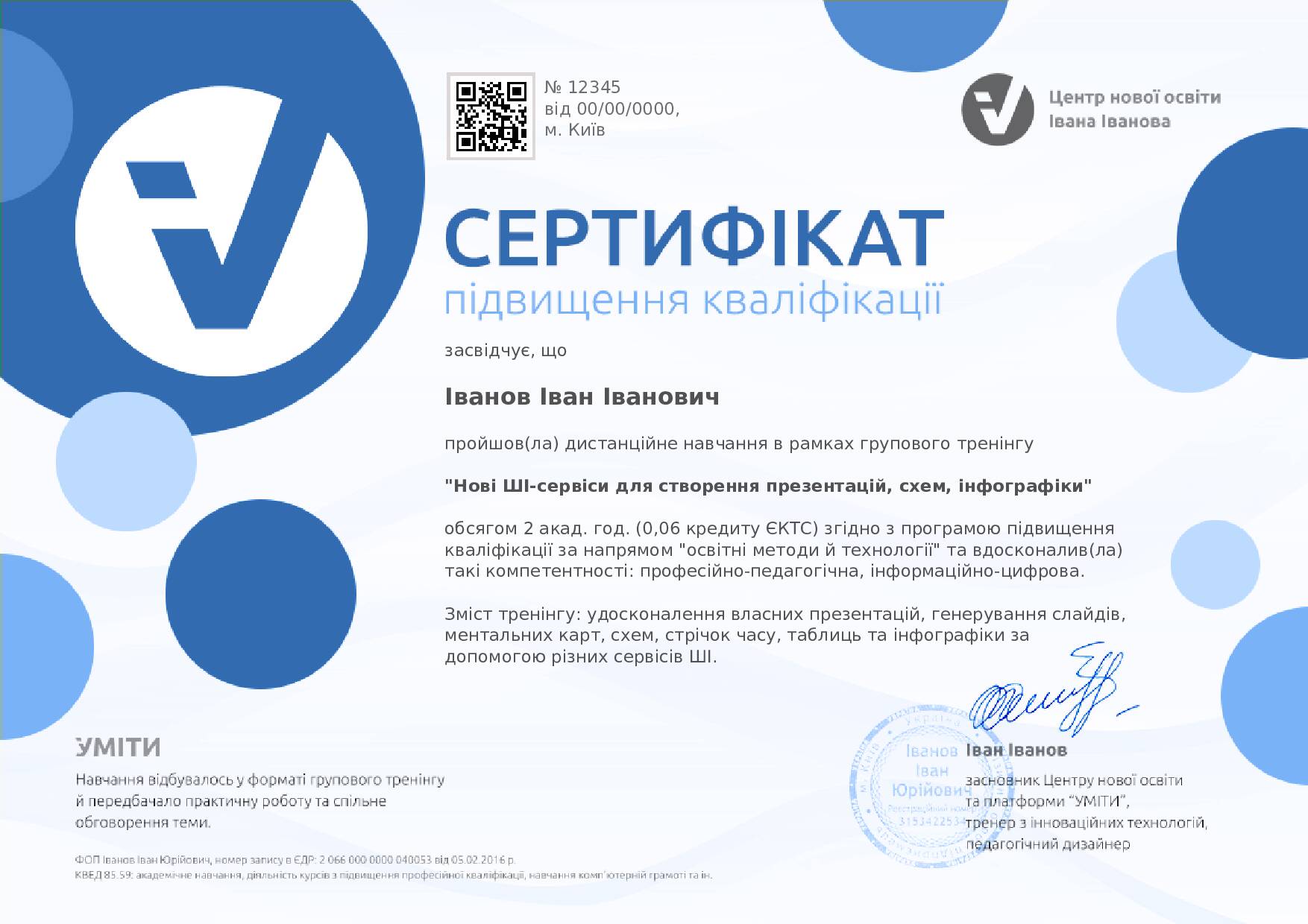Центр нової освіти Івана Іванова (платформа "УМІТИ") є суб'єктом підвищення кваліфікації.Цей тренінг відповідає державним вимогам. Сертифікат, що видається, рекомендується до зарахування педпрацівнику як підвищення кваліфікації обсягом 2 акад. год. (0,06 кредиту ЄКТС) згідно Закону України "Про освіту", Постанови КМУ від 21.08.2019 № 800 та Постанови КМУ від 27.12.2019 № 1133.