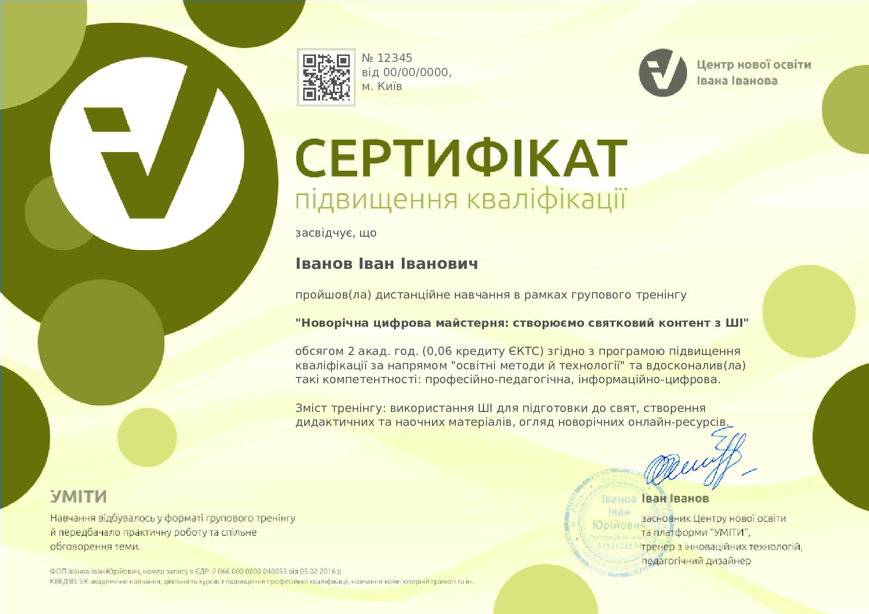 - офіційний сертифікат підвищення кваліфікації (КВЕД 85.59);