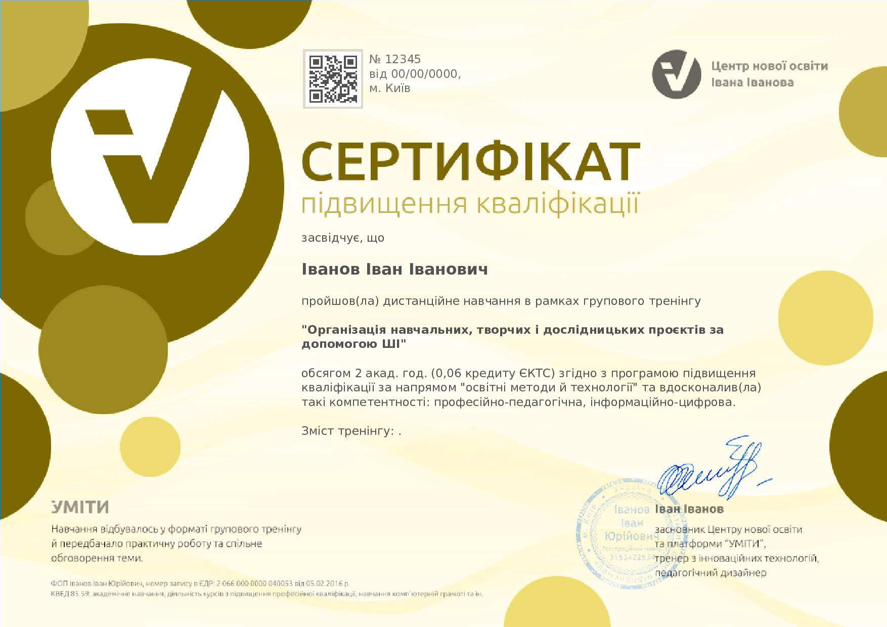 Центр нової освіти Івана Іванова (платформа "УМІТИ") є суб'єктом підвищення кваліфікації.Цей тренінг відповідає державним вимогам. Сертифікат, що видається, рекомендується до зарахування педпрацівнику як підвищення кваліфікації обсягом 2 акад. год. (0,06 кредиту ЄКТС) згідно Закону України "Про освіту", Постанови КМУ від 21.08.2019 № 800 та Постанови КМУ від 27.12.2019 № 1133.
